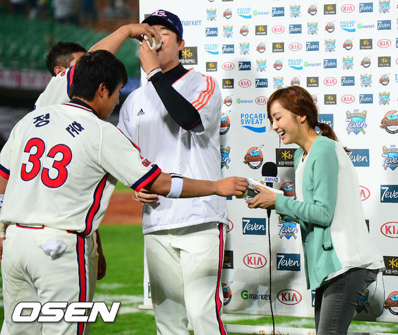 경기를 마치고 롯데 승리투수 이재곤이 인터뷰를 할때 황재균이 음료를 갖다주는 세레머니를 하고 있다. 이때 롯데 정훈이 윤태진 아나운서에게도 주스를 주고 있다. / rumi@osen.co.kr