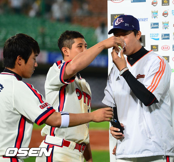 경기를 마치고 롯데 승리투수 이재곤이 인터뷰를 할때 황재균이 음료를 갖다주는 세레머니를 하고 있다. / rumi@osen.co.kr