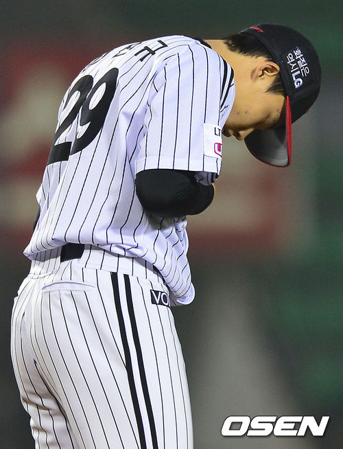 29일 오후 서울 잠실야구장에서 '2013 한국야쿠르트 세븐 프로야구' LG 트윈스와 한화 이글스의 경기가 열렸다. 9회초 한화 공격, 최근 물벼락 세리머니로 논란이 된 LG 투수 임찬규가 마운드에 올라 투구를 앞두고 마음을 다잡는 제스처를 취하고 있다.