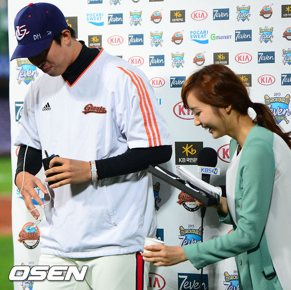 경기를 마치고 롯데 승리투수 이재곤이 인터뷰를 할때 황재균이 음료를 갖다주는 세레머니가 진행됐다. 이 후 윤태진 아나운서와 이재곤이 웃고 있다. / rumi@osen.co.kr