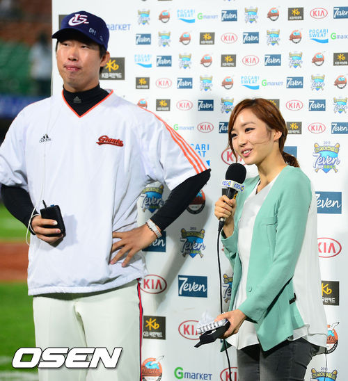 경기를 마치고 롯데 승리투수 이재곤이 인터뷰를 할때 황재균이 음료를 갖다주는 세레머니가 진행된 후 인터뷰가 이어지고 있다. / rumi@osen.co.kr
