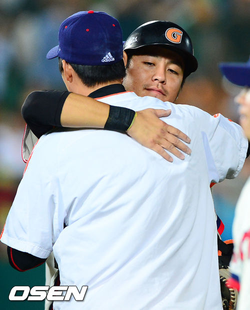 경기를 마치고 롯데 승리투수 이재곤과 강민호가 포옹을 하고 있다. / rumi@osen.co.kr
