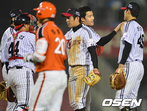 9회초 한화 공격 2사 만루 상황, 9번 정범모를 우익수 플라이로 잡으며 경기를 마무리지은 LG 투수 임찬규가 동료들과 마운드에서 하이파이브를 나누고 있다. /dreamer@osen.co.kr