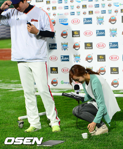 경기를 마치고 롯데 승리투수 이재곤이 인터뷰를 할때 황재균이 음료를 갖다주는 세레머니가 진행됐고. 이때 롯데 정훈이 윤태진 아나운서에게도 주스를 줬다. 윤태진 아나운서가 잠시 주스를 내려놓고 있다. / rumi@osen.co.kr