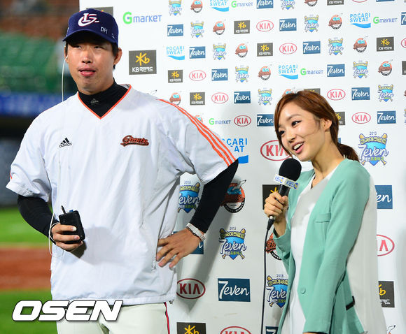 경기를 마치고 롯데 승리투수 이재곤이 인터뷰를 할때 황재균이 음료를 먹여주는 세레모니가 진행된 후 인터뷰가 이어지고 있다. / rumi@osen.co.kr