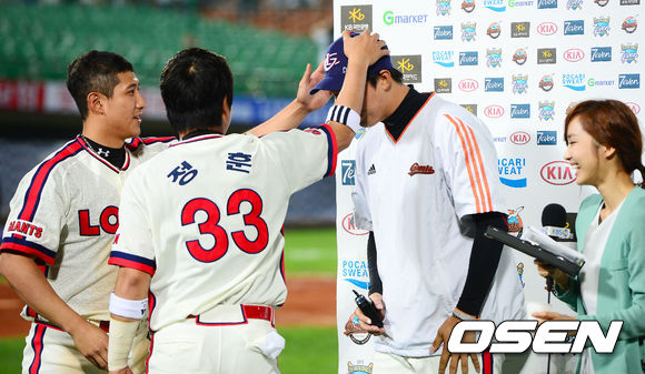 경기를 마치고 롯데 승리투수 이재곤이 인터뷰를 할때 황재균이 음료를 먹여주는 세레모니를 한 후 정훈과 황재균이 이재곤을 쓰다듬고 있다. / rumi@osen.co.kr