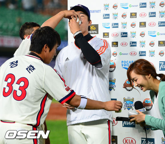 경기를 마치고 롯데 승리투수 이재곤이 인터뷰를 할때 황재균이 음료를 먹여주는 세레모니를 하고 있다. 이때 롯데 정훈이 윤태진 아나운서에게도 주스를 주고 있다. / rumi@osen.co.kr