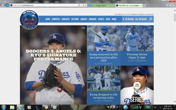다저스 팬 사이트인 트루블루엘에이닷컴(Truebluela.com)은 지난 29일(이하 한국시간) 데뷔 첫 완봉승을 거둔 류현진의 사진을 사이트 메인화면에 싣고 집중 조명했다. 류현진이 뛰어난 성적(signature performance)을 거두고 LA 에인절스에 완봉승을 거뒀다고도 전했다.