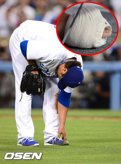 그러나 그게 아니었다. 류현진은 4회 발등을 강타당한 후 덕아웃 뒤쪽의 보이지 않는 공간에서 팀 닥터의 도움아래 간단히 치료를 받았다. 돈`매팅리 감독과 릭 허니컷 투수코치가 근심어린 표정으로 류현진을 지켜봤다. 하지만 류현진은 계속 던지겠다는 의사를 보였고, 부상 이후 오히려 최고 95마일 강속구를 뿌리는 괴력을 뽐냈다. 타석에서도 땅볼을 친 다음 1루를 향해 전력질주했다.