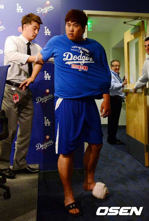 경기 후 인터뷰실에 들어선 류현진은 왼 발등에 붕대를 칭칭 감은 상태였다. 부기가 채 가라앉지 않은 듯 절뚝거리며 제대로 걷지 못할 정도로 심각해 보였다. 통역 마틴 김의 부축을 받아 이동할 정도. 하지만 류현진은 "뼈에는 이상이 없는 것 같다"며 몸 상태에 큰 문제가 없다고 의연하게 답했다. 뼈만 부러지지 않으면 견딜 수 있다는 뜻이었다.