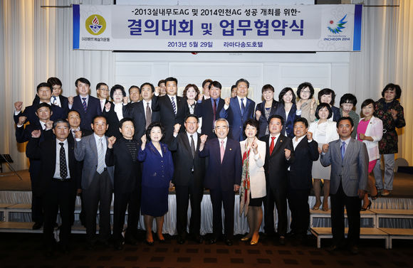 2014 인천아시안게임조직위원회(위원장 김영수)는 29일 (사)바르게살기운동 인천광역시협의회와 '2013 실내·무도(武道)아시아경기대회' 및 '2014 인천아시아경기대회'의 성공 개최를 위한 결의대회를 갖고, 양 대회의 성공개최와 지역사회 발전을 도모하기 위한 상호 협조체계 구축을 위한 업무협약 MOU를 체결하였다.