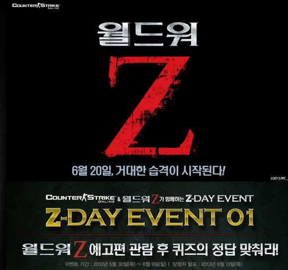 넥슨이 30일 자사의 인기 FPS게임 ‘카운터스트라이크 온라인(Counter-Strike Online)’에서 신작 영화 ‘월드워Z(World War Z)’와의 제휴 이벤트 ‘Z-DAY’를 실시한다고 밝혔다.