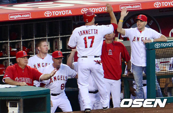 30일 오전(이하 한국시간) 미국 캘리포니아주 애너하임 에인절스타디움에서 열린 LA 에인절스와 LA 다저스의 경기 2회말 2사 3루 아이바의 1타점 2루타에 득점에 성공한 이아네타가 덕아웃에서 동료들과 하이파이브를 하고 있다.