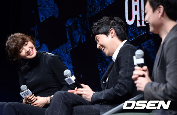 30일 오후 서울 CGV 압구정에서 진행된 영화 '더 웹툰:예고살인' 제작보고회에서 김용균 감독의 이야기에 이시영, 엄기준이 미소를 짓고 있다.