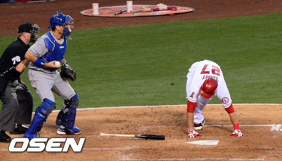 30일 오전(이하 한국시간) 미국 캘리포니아주 애너하임 에인절스타디움에서 열린 LA 에인절스와 LA 다저스의 경기 2회말 2사 2루 트라웃이 몸쪽 볼을 피하면서 넘어지고 있다.