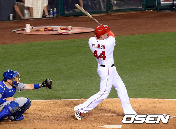 30일 오전(이하 한국시간) 미국 캘리포니아주 애너하임 에인절스타디움에서 열린 LA 에인절스와 LA 다저스의 경기 5회말 2사 1루 트럼보가 투런포를 치고 있다.