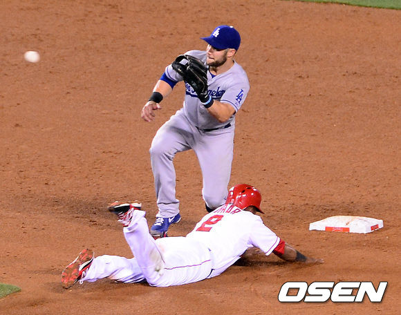 30일 오전(이하 한국시간) 미국 캘리포니아주 애너하임 에인절스타디움에서 열린 LA 에인절스와 LA 다저스의 경기 5회초 무사 1루 트라웃 타석, 1루주자 아이바가 도루에 실패하고 있다.