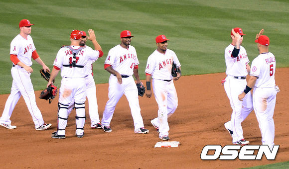 30일 오전(이하 한국시간) 미국 캘리포니아주 애너하임 에인절스타디움에서 열린 LA 에인절스와 LA 다저스의 경기 종료 후 에인절스 선수들이 하이파이브를 하고 있다.