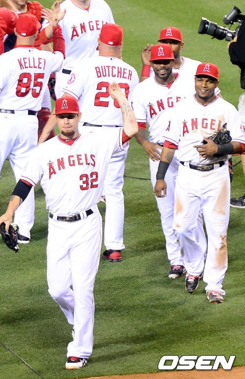 30일 오전(이하 한국시간) 미국 캘리포니아주 애너하임 에인절스타디움에서 열린 LA 에인절스와 LA 다저스의 경기 종료 후 에인절스 선수들이 하이파이브를 하고 있다.