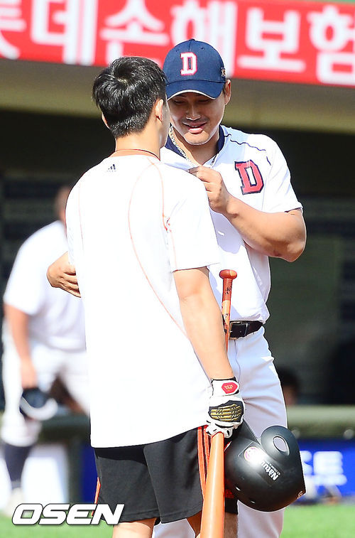 30일 오후 부산 사직구장에서 2013 한국야쿠르트 세븐프로야구 롯데 자이언츠와 두산 베어스의 경기가 열릴 예정인 가운데 양팀 훈련 시간에 두산 홍성흔이 롯데 손아섭과 장난을 치고 있다.