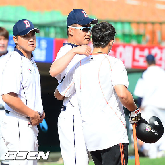 30일 오후 부산 사직구장에서 2013 한국야쿠르트 세븐프로야구 롯데 자이언츠와 두산 베어스의 경기가 열릴 예정인 가운데 양팀 훈련 시간에 두산 홍성흔과 이혜천이 어제 경기에서 결승타를 친 롯데 손아섭과 장난을 치고 있다.