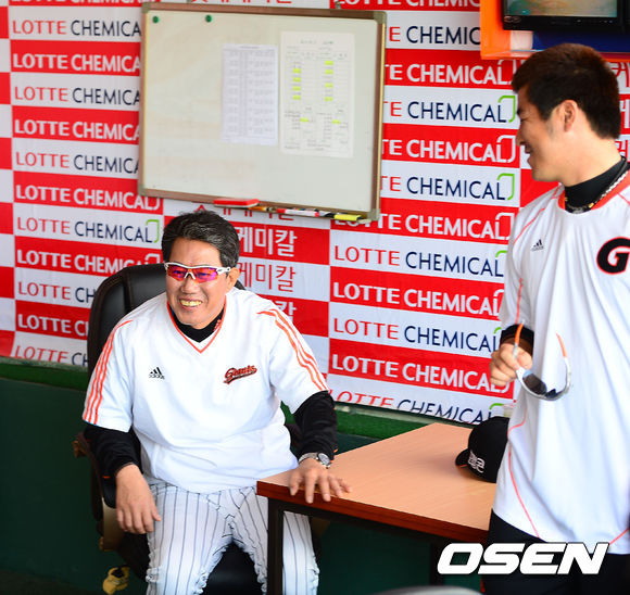 30일 오후 부산 사직구장에서 2013 한국야쿠르트 세븐프로야구 롯데 자이언츠와 두산 베어스의 경기가 열릴 예정인 가운데 양팀 훈련 시간에 롯데 김시진 감독이 취재진과 인터뷰를 할때 롯데 강민호를 불러 왜 번트를 대지 않았냐고 물어보자 강민호가 장난으로 "에이~ 저 강민호인데요" 답하며 환하게 웃고 있다.