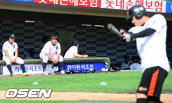 30일 오후 부산 사직구장에서 2013 한국야쿠르트 세븐프로야구 롯데 자이언츠와 두산 베어스의 경기가 열릴 예정인 가운데 양팀 훈련 시간에 두산 최준석과 이종욱이 덕아웃에서 심각한 표정으로 롯데의 타격훈련을 지켜보고 있다.