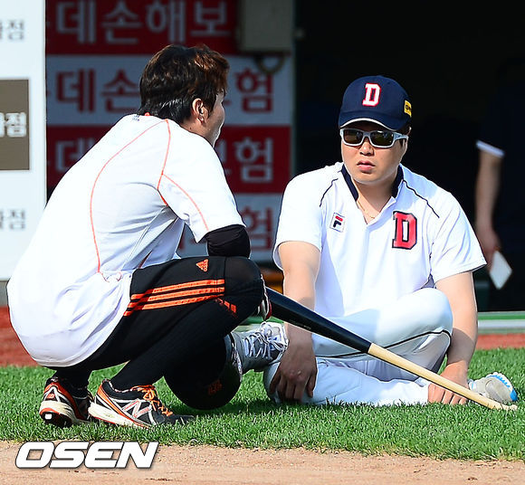 30일 오후 부산 사직구장에서 2013 한국야쿠르트 세븐프로야구 롯데 자이언츠와 두산 베어스의 경기가 열릴 예정인 가운데 양팀 훈련 시간에 두산 양의지와 롯데 용덕한이 얘기를 나누고 있다.