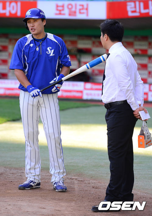 30일 오후 인천 문학구장에서 열리는 '2013 한국야쿠르트 세븐프로야구' SK 와이번스와 삼성 라이온즈의 경기, 경기에 앞서 삼성 이승엽이 박재홍 해설위원과 이야기를 나누고 있다.