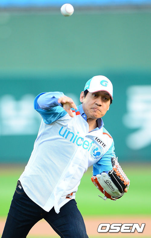 30일 오후 부산 사직구장에서 열린 2013 한국야쿠르트 세븐프로야구 롯데 자이언츠와 두산 베어스의 경기에서 유니세프 홍보대사 영화배우 안성기가 시구를 하고 있다.
