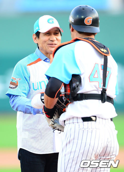 30일 오후 부산 사직구장에서 열린 2013 한국야쿠르트 세븐프로야구 롯데 자이언츠와 두산 베어스의 경기에서 유니세프 홍보대사 영화배우 안성기가 시구를 한 후 강민호에게 시구 볼을 받고 있다.