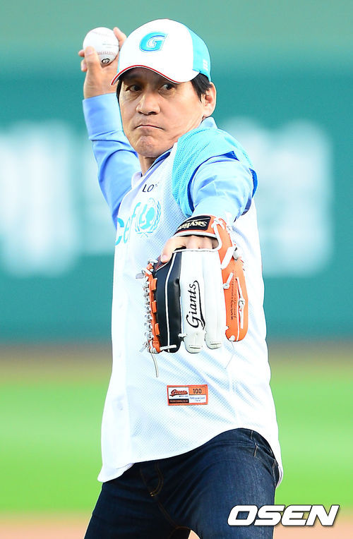 30일 오후 부산 사직구장에서 열린 2013 한국야쿠르트 세븐프로야구 롯데 자이언츠와 두산 베어스의 경기에서 유니세프 홍보대사 영화배우 안성기가 시구를 하고 있다.