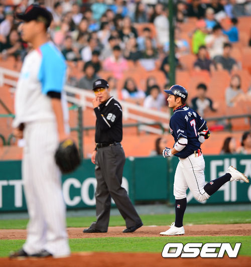 30일 오후 부산 사직구장에서 열린 2013 한국야쿠르트 세븐프로야구 롯데 자이언츠와 두산 베어스의 경기에서 3회초 1사 주자 없는 상황에서 두산 최주환이 선취 우월 솔로홈런을 날린 후 그라운드를 돌고 있다.