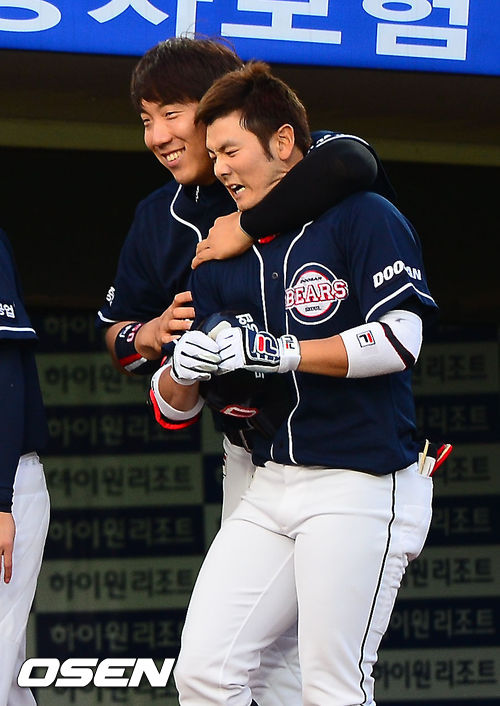 30일 오후 부산 사직구장에서 열린 2013 한국야쿠르트 세븐프로야구 롯데 자이언츠와 두산 베어스의 경기에서 3회초 1사 주자 없는 상황에서 두산 최주환이 선취 우월 솔로홈런을 날린 후 덕아웃에서 김현수에게 목조르기를 받고 있다.