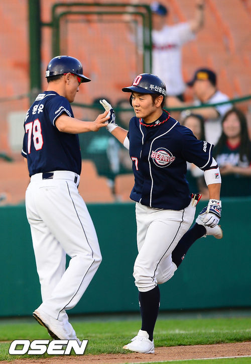 30일 오후 부산 사직구장에서 열린 2013 한국야쿠르트 세븐프로야구 롯데 자이언츠와 두산 베어스의 경기에서 3회초 1사 주자 없는 상황에서 두산 최주환이 선취 우월 솔로홈런을 날린 후 3루에서 조원우 코치와 하이파이브를 하고 있다.