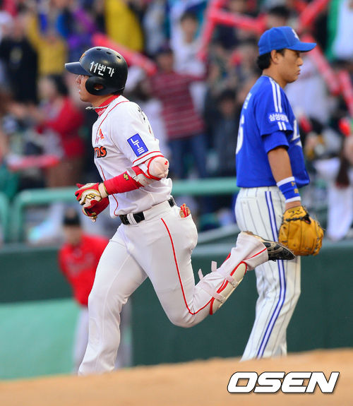 30일 오후 인천 문학구장에서 열린 '2013 한국야쿠르트 세븐프로야구' SK 와이번스와 삼성 라이온즈의 경기 1회말 2사 SK 최정이 솔로 홈런을 날리고 베이스를 돌고 있다.