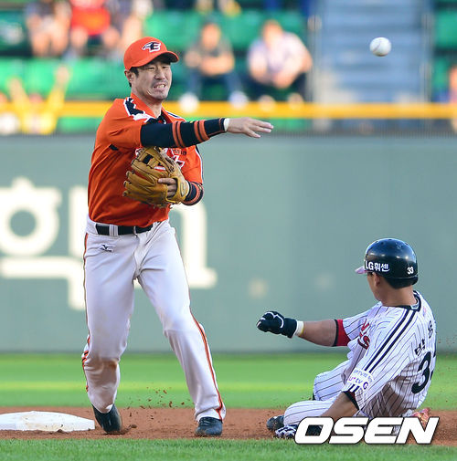 30일 오후 서울 잠실야구장에서 '2013 한국야쿠르트 세븐 프로야구' LG 트윈스 대 한화 이글스의 경기가 열렸다. 1회말 LG 공격 1사 1, 3루 상황 4번 정의윤의 내야 땅볼 때 한화 2루수 한상훈이 주자 박용택을 포스아웃 시킨 뒤 1루로 송구하고 있다.