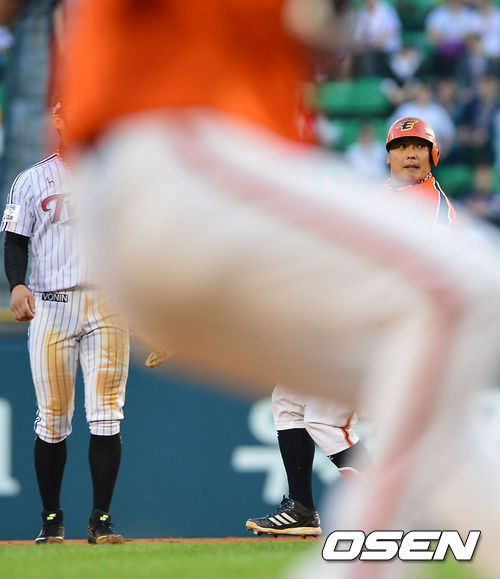 30일 오후 서울 잠실야구장에서 '2013 한국야쿠르트 세븐 프로야구' LG 트윈스 대 한화 이글스의 경기가 열렸다. 3회초 한화 공격 1사 만루 상황 4번 김태균이 선제 2타점 오른쪽 파울라인 안쪽에 떨어지는 2루타를 날리고 홈을 바라보며 2루에 안착하고 있다.