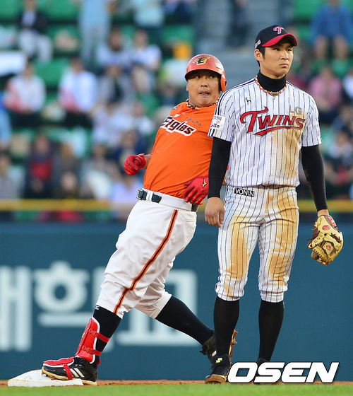 30일 오후 서울 잠실야구장에서 '2013 한국야쿠르트 세븐 프로야구' LG 트윈스 대 한화 이글스의 경기가 열렸다. 3회초 한화 공격 1사 만루 상황 4번 김태균이 선제 2타점 오른쪽 파울라인 안쪽에 떨어지는 2루타를 날리고 2루에 안착하고 있다.