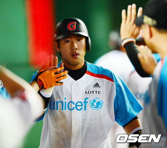 30일 오후 부산 사직구장에서 열린 2013 한국야쿠르트 세븐프로야구 롯데 자이언츠와 두산 베어스의 경기에서 4회말 무사 주자 만루 롯데 이승화의 우익수 앞 1타점 적시타때 홈을 밟은 전준우가 덕아웃에서 하이파이브를 하고 있다.