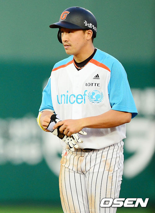 30일 오후 부산 사직구장에서 열린 2013 한국야쿠르트 세븐프로야구 롯데 자이언츠와 두산 베어스의 경기에서 3회말 2사 1,2루에서 손아섭이 역전 적시타를 치고 장갑을 벗고 있다.