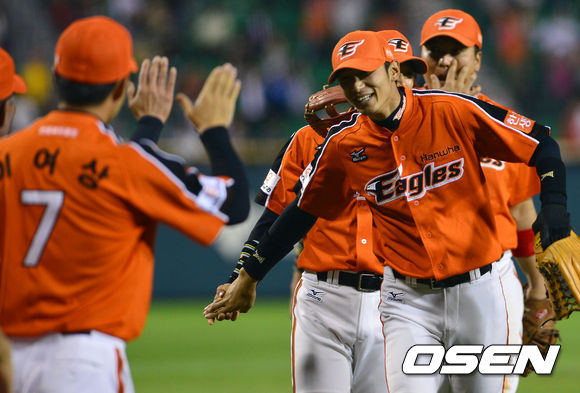 30일 오후 서울 잠실야구장에서 '2013 한국야쿠르트 세븐 프로야구' LG 트윈스 대 한화 이글스의 경기가 열렸다. 5회말 LG 공격 1사 1루 상황, 1번 오지환의 홈런성 타구를 멋지게 잡아낸 한화 좌익수 추승우가 더그아웃으로 들어오며 동료들과 인사를 나누고 있다.