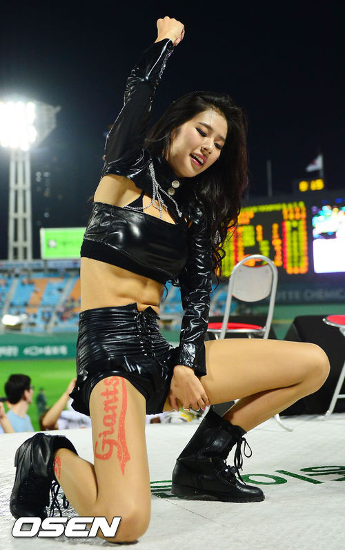 30일 오후 부산 사직구장에서 열린 2013 한국야쿠르트 세븐프로야구 롯데 자이언츠와 두산 베어스의 경기에서 롯데 치어리더 박기량이 화려한 무대를 선보이고 있다.