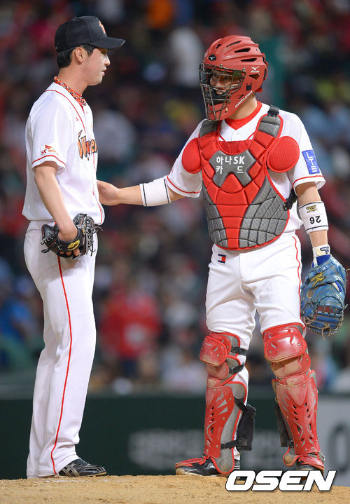 30일 오후 인천 문학구장에서 열린 '2013 한국야쿠르트 세븐프로야구' SK 와이번스와 삼성 라이온즈의 경기 7회초 1사 2루 삼성 강봉규의 타석, SK 진해수 투수의 폭투때 박경완 포수가 마운드에 올라 진해수 투수와 이야기를 나누고 있다