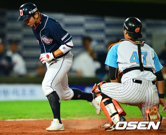 30일 오후 부산 사직구장에서 열린 2013 한국야쿠르트 세븐프로야구 롯데 자이언츠와 두산 베어스의 경기에서 6회초 1사 주자 만루 이종욱의 2타점 적시타때 홈 송구가 빠지며 최주환이 홈으로 들어오고 있다.