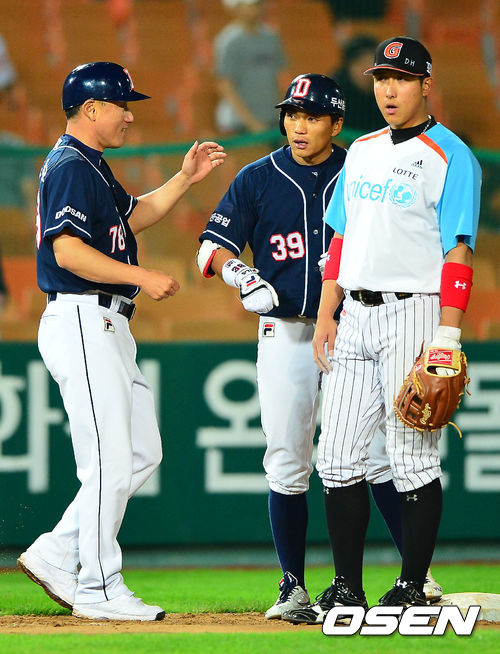 30일 오후 부산 사직구장에서 열린 2013 한국야쿠르트 세븐프로야구 롯데 자이언츠와 두산 베어스의 경기에서 6회초 1사 주자 만루 이종욱이 2타점 적시타를 날린 후 2루에서 기뻐하고 있다.