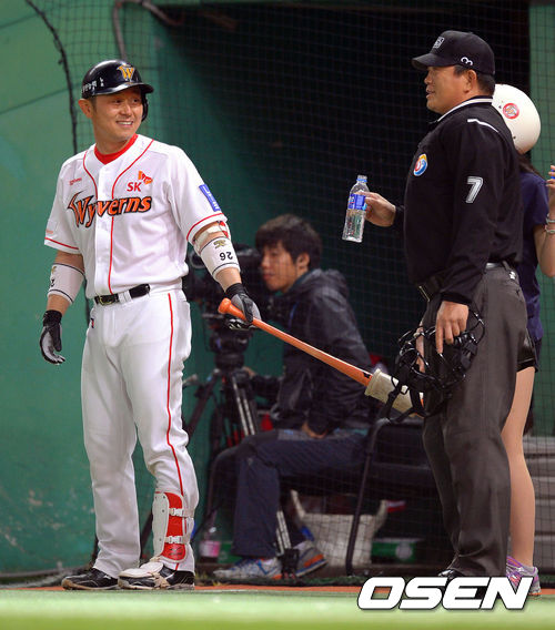30일 오후 인천 문학구장에서 열린 '2013 한국야쿠르트 세븐프로야구' SK 와이번스와 삼성 라이온즈의 경기 7회말 2사 SK 박경완이 대기타석에서 문승훈 구심과 이야기를 나누고 있다 . 박경완의 이날 출전은 지난해 7월 2일 이후 1년여만 1군에 복귀 출전이다.