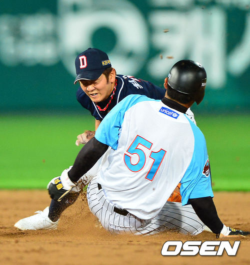 30일 오후 부산 사직구장에서 열린 2013 한국야쿠르트 세븐프로야구 롯데 자이언츠와 두산 베어스의 경기에서 6회초 1사 주자 1루 롯데 황재균 타석에서 1루 주자 이승화가 2루 도루를 시도, 두산 2루소 최주환이 태그아웃 시키고 있다.