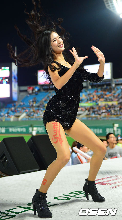 30일 오후 부산 사직구장에서 열린 2013 한국야쿠르트 세븐프로야구 롯데 자이언츠와 두산 베어스의 경기에서 롯데 치어리더 박기량이 무대 위에서 스페셜 스테이지를 꾸미고 있다.