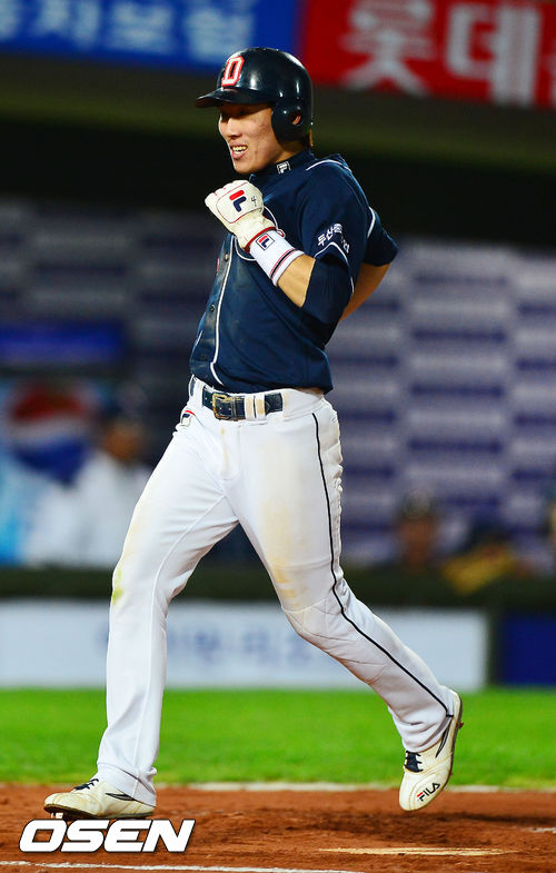 30일 오후 부산 사직구장에서 열린 2013 한국야쿠르트 세븐프로야구 롯데 자이언츠와 두산 베어스의 경기에서 6회초 1사 주자 만루 최주환이 좌익수 왼쪽 2타점 적시타를 때 홈을 밟은 허경민이 미소지으며 덕아웃으로 들어오고 있다.